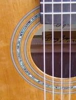 - Hand laid abalone inlay rosette with pearl fret markers.